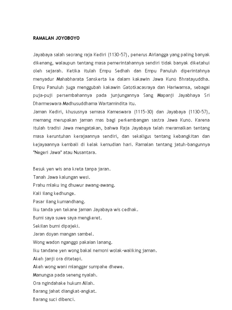 Iku tanda yen tekane jaman Joyoboyo wis cedak. PJalananIngat ini hanyalah sebuah ramalan kuno jangan dipercaya 100 karena bisa saja hanya kebetulan tepat. Sri Mapanji Jayabaya Varmesvara or Jayabhaya Javanese spelled.